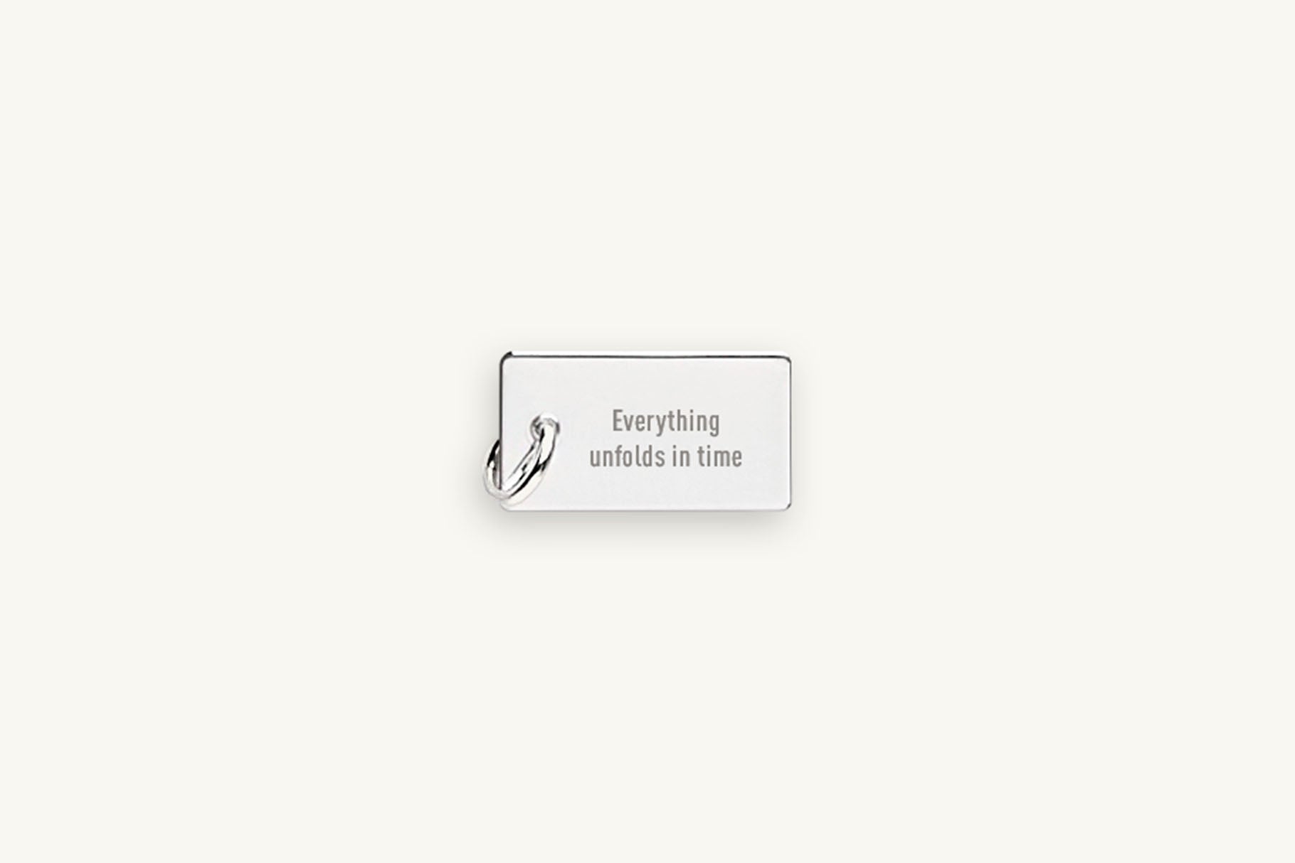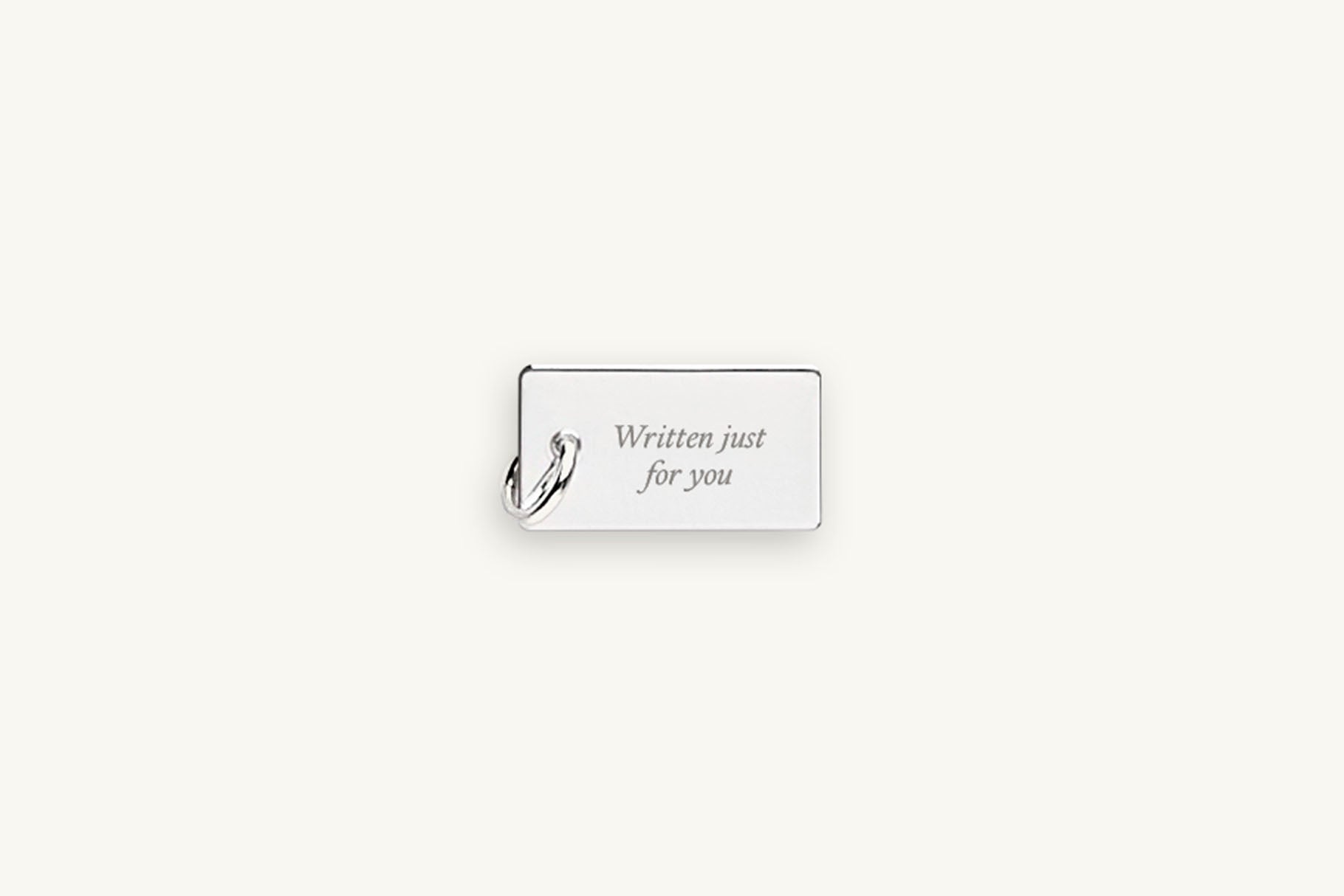 The Whisper Flow Message Charm features a slender, elongated silver charm engraved with your chosen words. Its flowing shape allows longer phrases to unfold softly, creating a light, intimate piece designed to carry personal meaning.