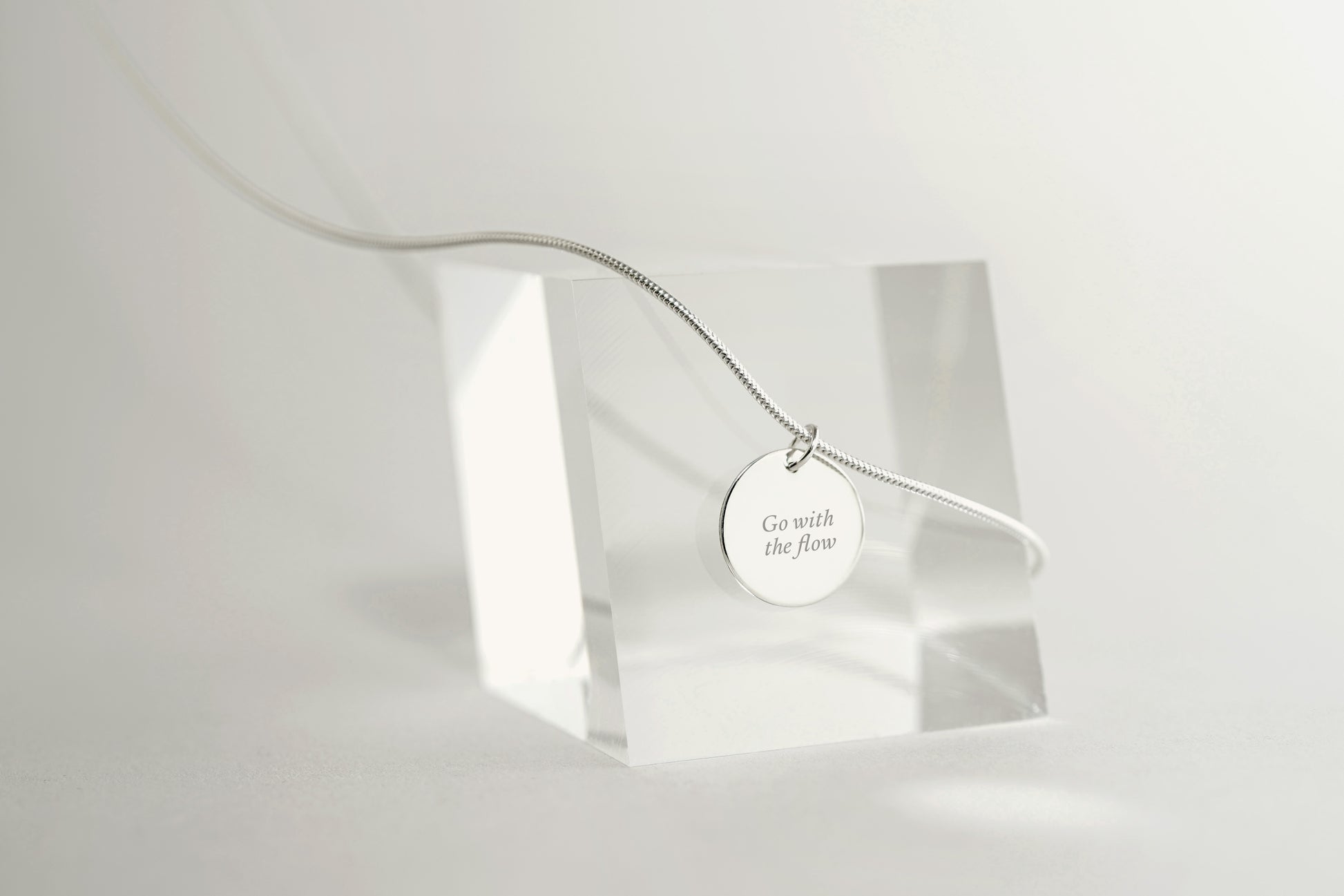 Flow meets form in the River Circle Message Charm Necklace. A perfectly round pendant rests on a sleek snake chain, turning your chosen words into a wearable emblem of intention, balance, and continuity.
