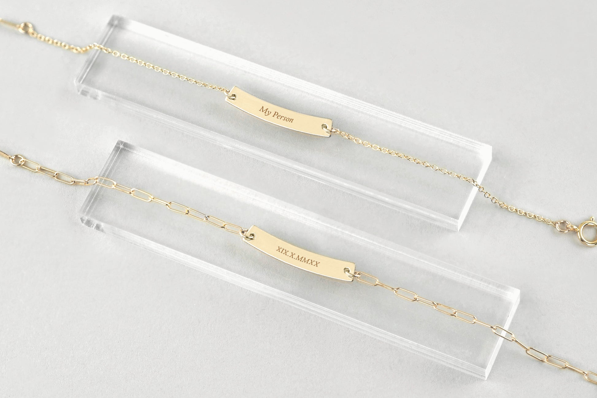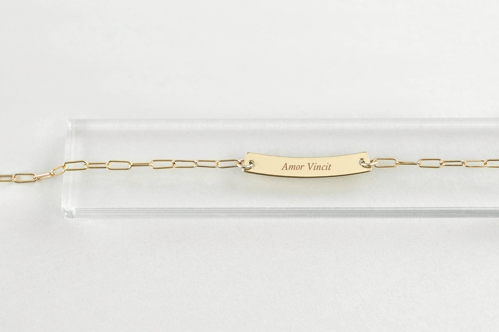 This slender bar is softly curved for a refined, sculptural silhouette that rests comfortably against the skin. Thoughtfully handcrafted and finished in luminous gold, it offers a timeless foundation for your favorite one-liner, name, date, or quiet reminder.